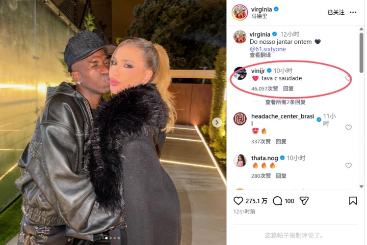 12月20日讯 维尼修斯的女友维尔吉尼娅在社媒晒出了与男友在马德里共进晚餐的动态,维尼修斯评论道:❤️想你了。